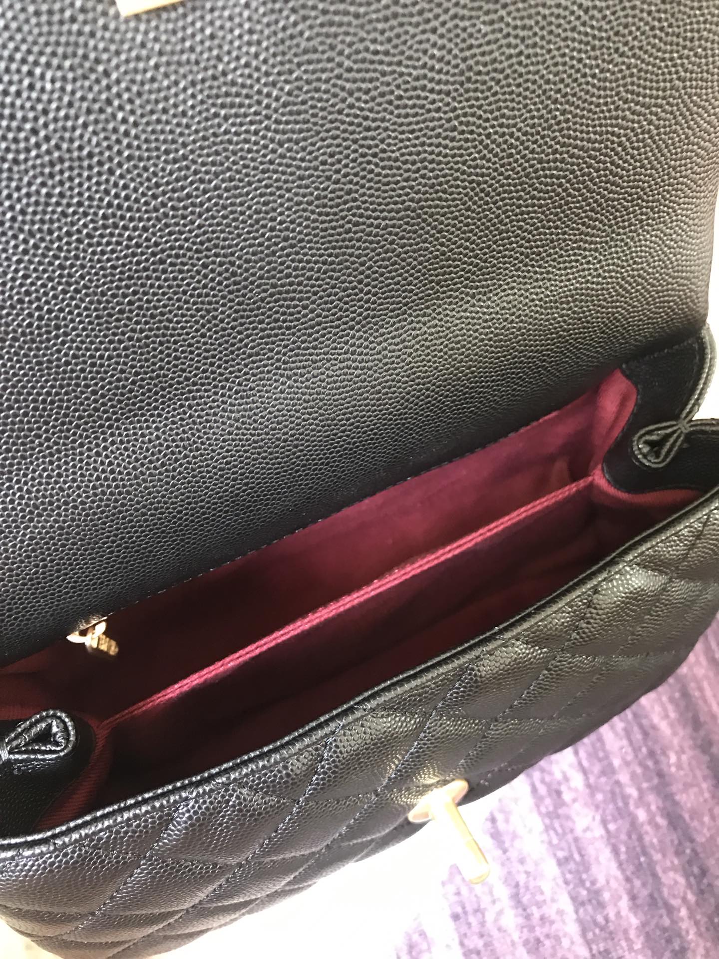 Mango superior de caviar coco acolchado negro con herrajes dorados 24