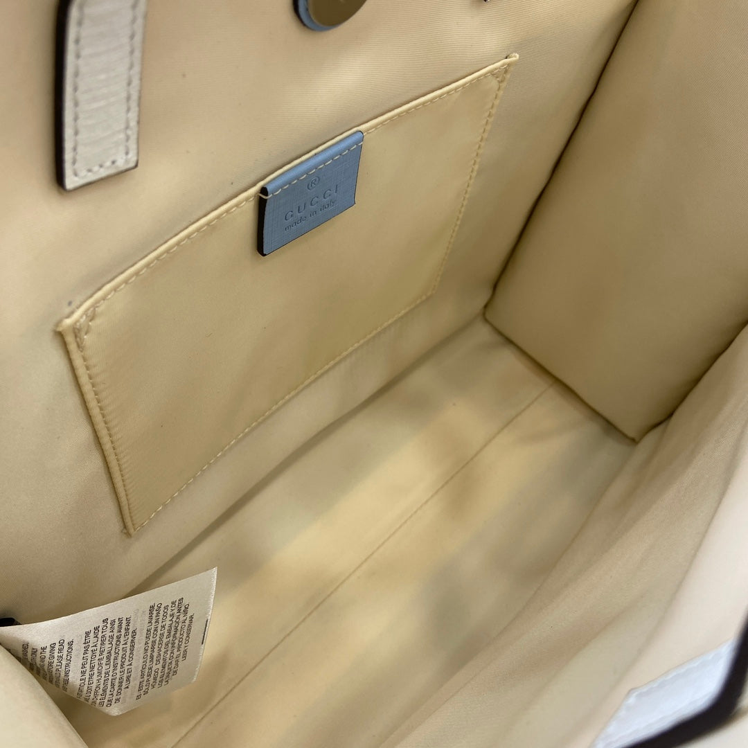 BOLSO TOTE INFANTIL 28 CON ESTAMPADO DE CACHORRO EN LONA BEIGE Y RIBETE DE PIEL DE BECERRO BLANCA