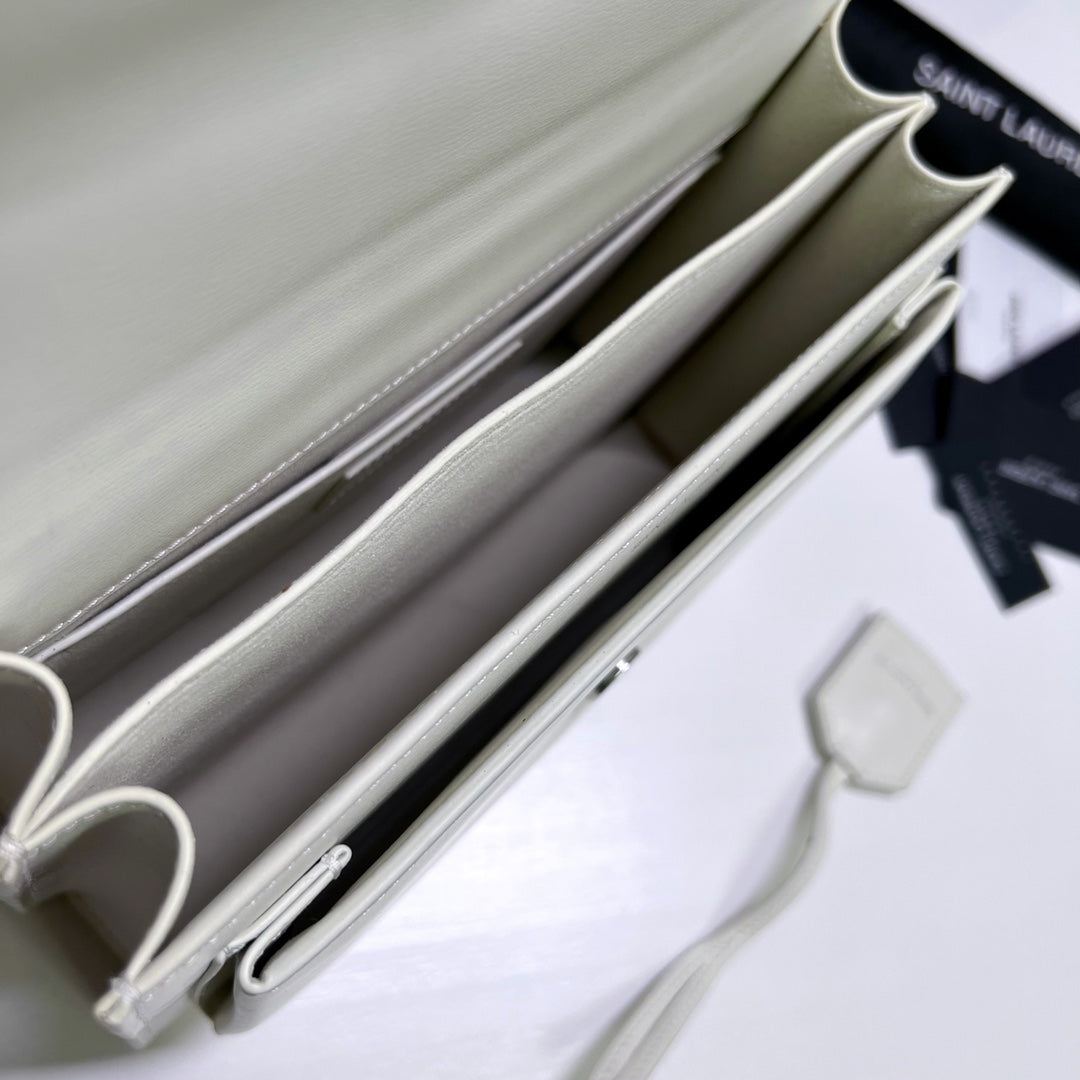 SUNSET MEDIUM 22 EN PIEL DE BECERRO BLANCA, HERRAJES PLATEADOS