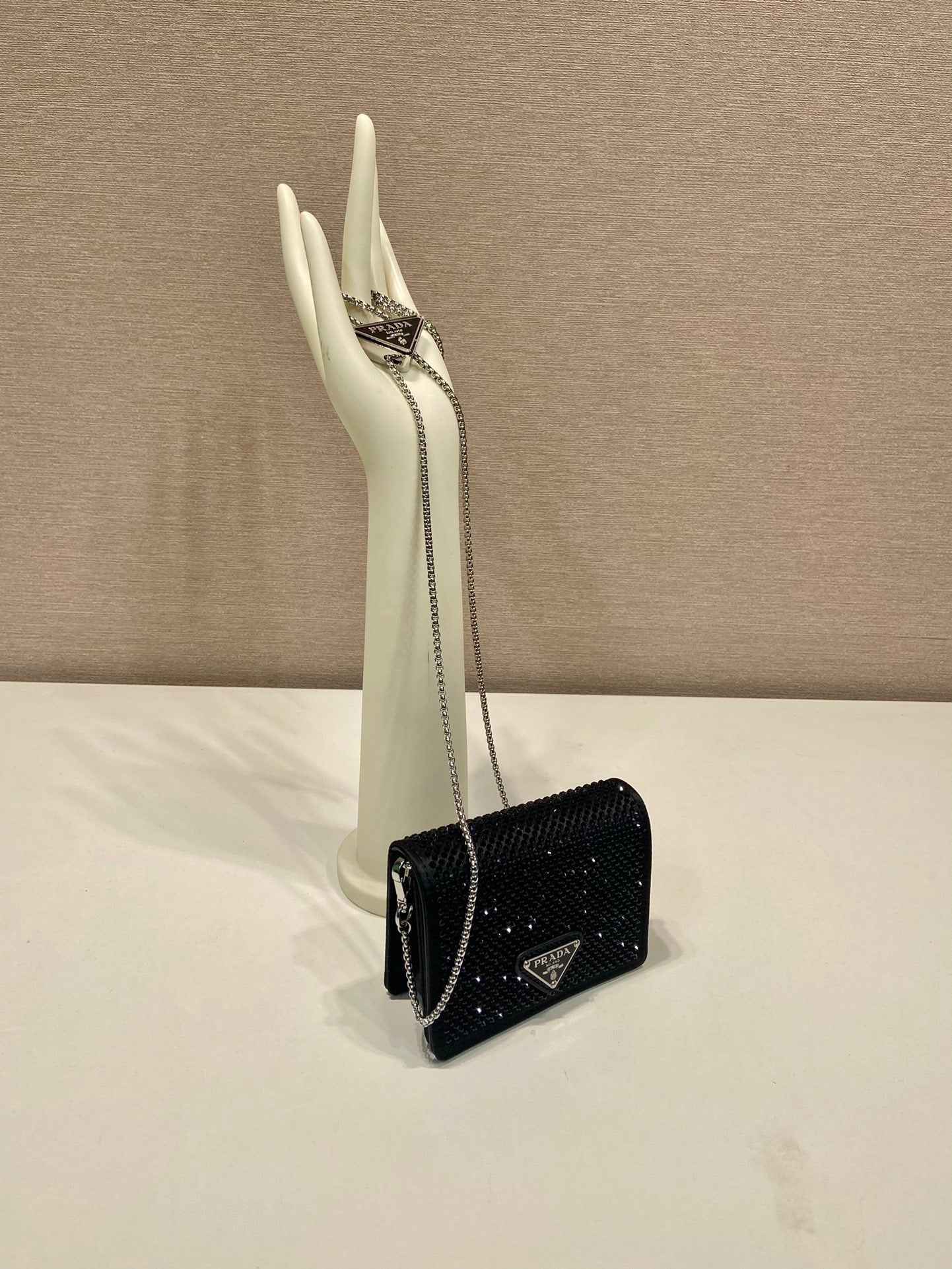 MINI SAC À RABAT 11 EN TISSU DUCHESSE NOIR AVEC CRISTAUX ATTACHÉS ET CHAÎNE ARGENTÉE