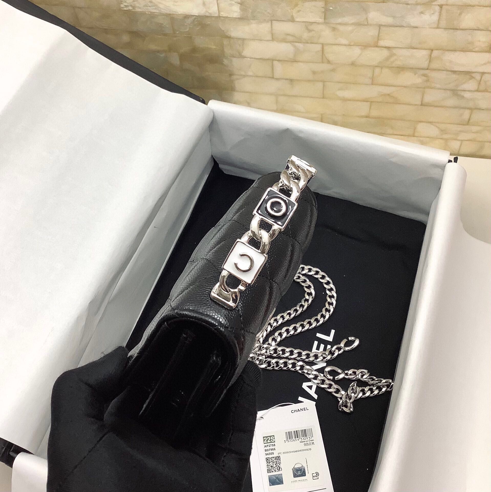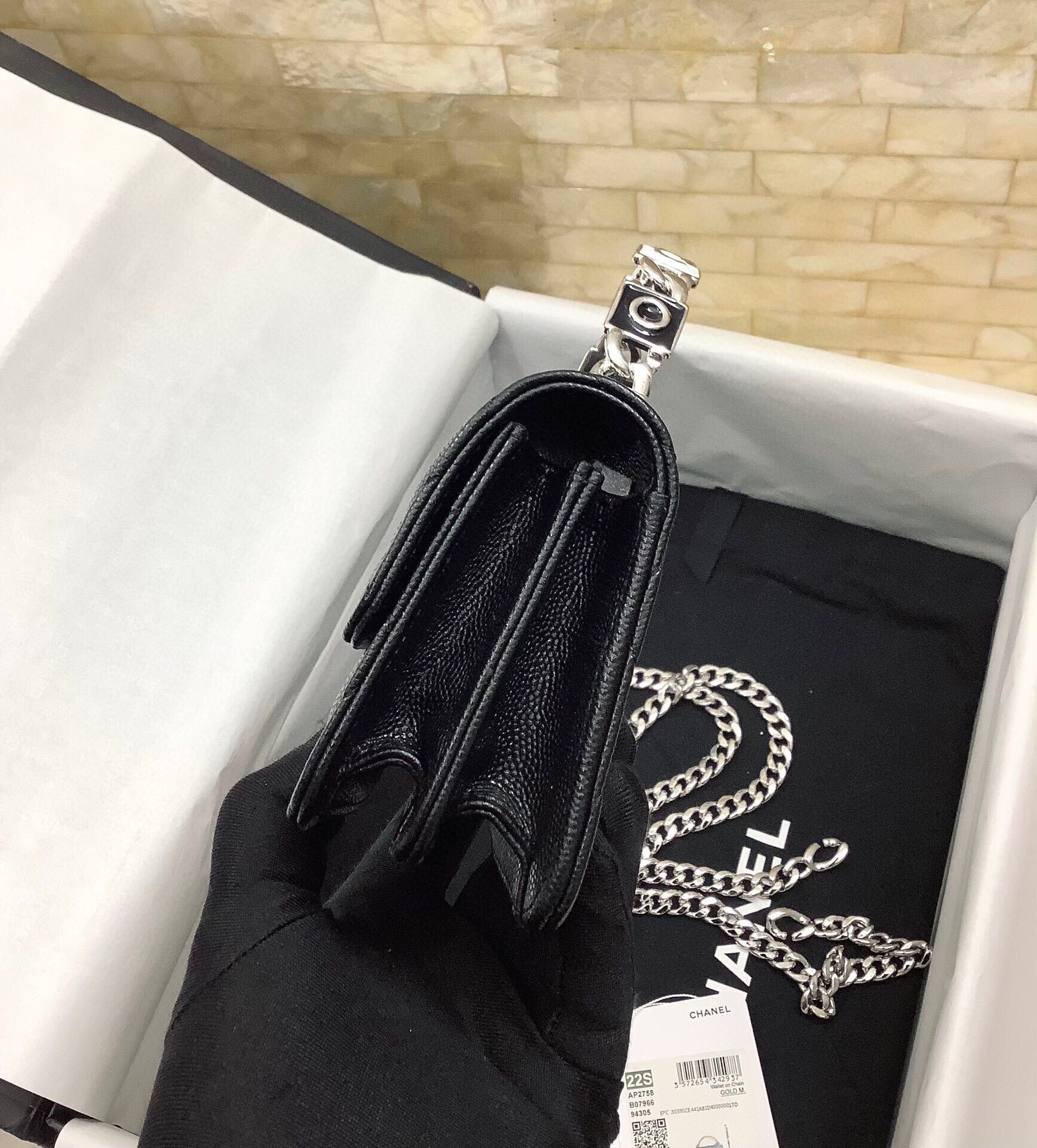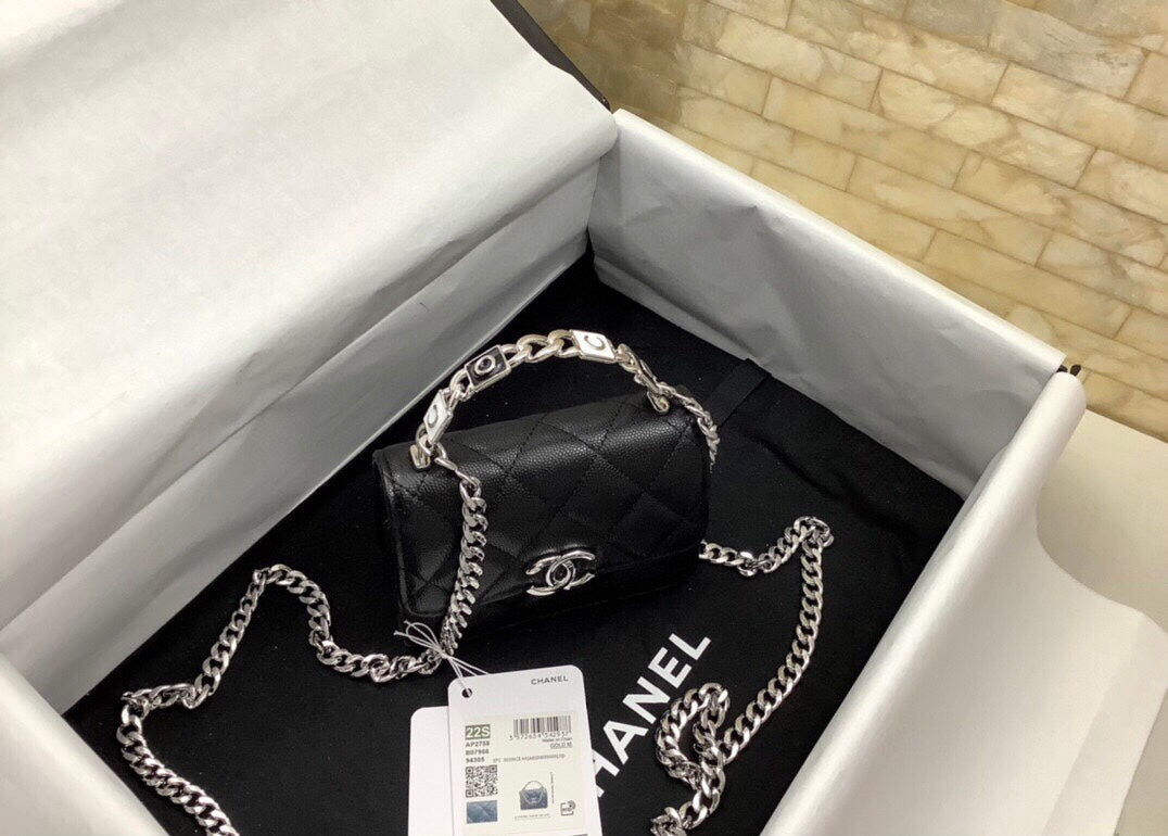 cc mini woc 13cm with top handle black quilted caviar leather silver hardware