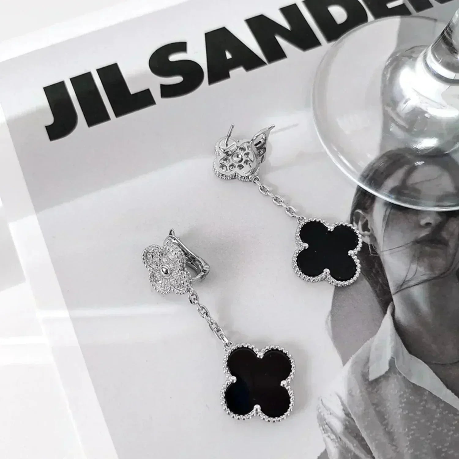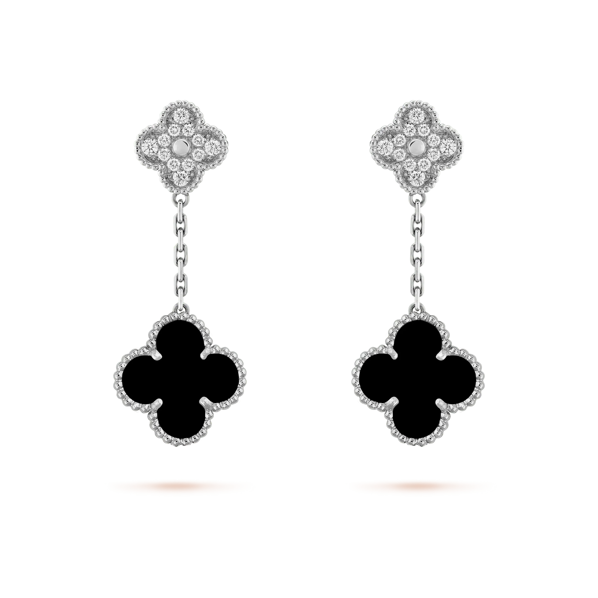 DIANA CLOVER 2 MOTIFS DIAMOND ONYX EARRINGS SILVER