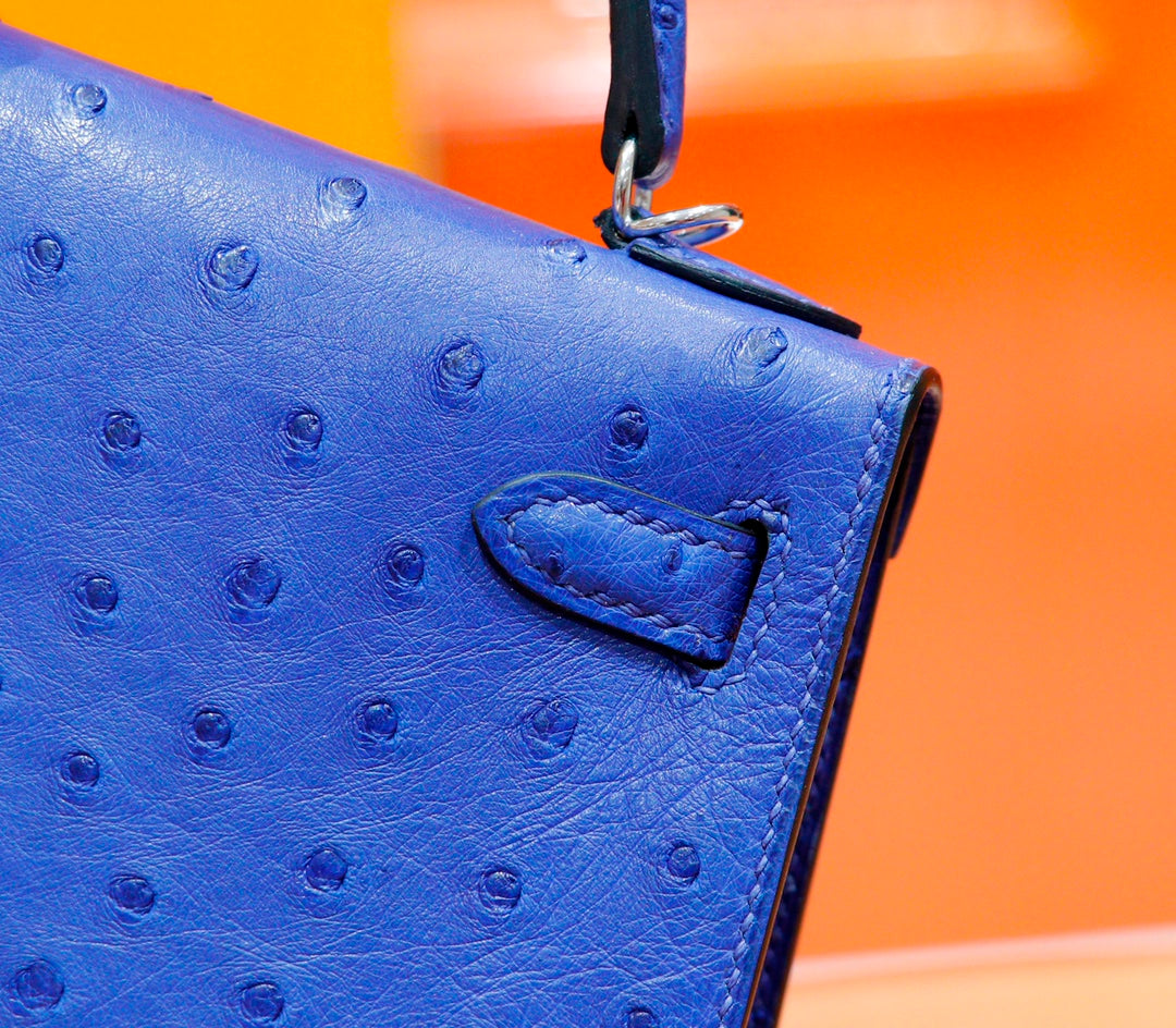 HM Mini Kelly 19cm Greek Blue Ostrich Silver Hardware