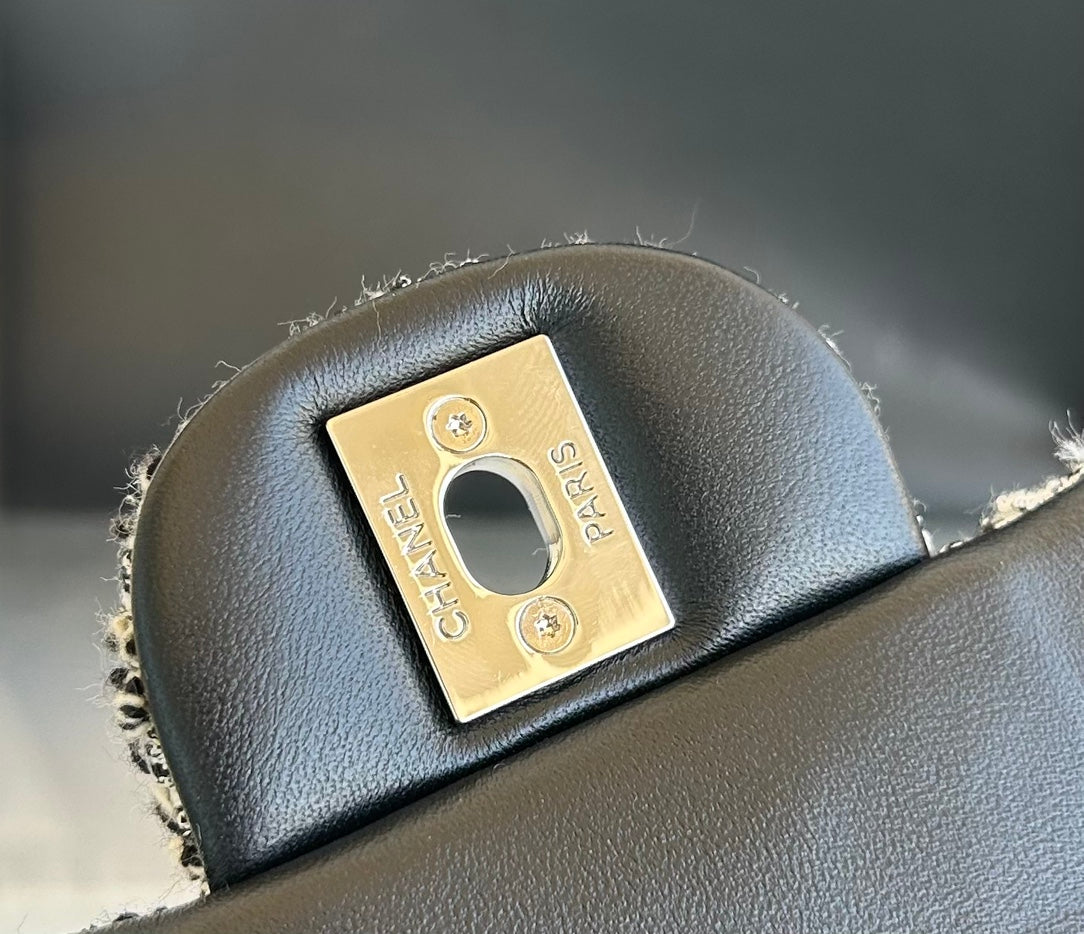 MEDIUM FLAP BAG 25 IN LIGHT GRAY TWEED SILVER HARDWARE